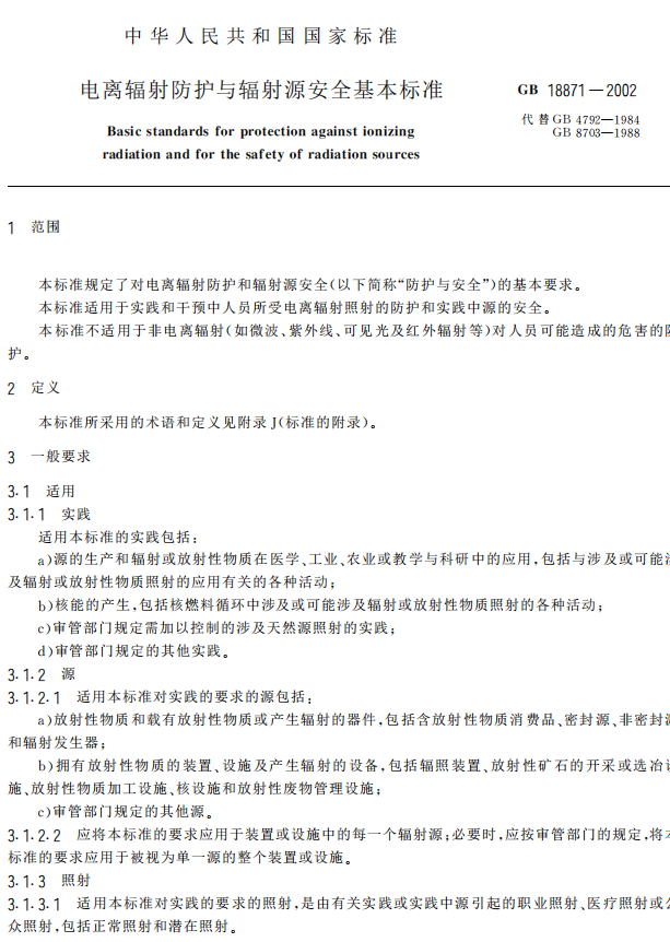 本標準的全部技術內(nèi)容均為強制性的) 本標準是根據(jù)六個國際組織*即+聯(lián)合國糧農(nóng)組織,國際原子能機構(gòu),國際勞工組織,經(jīng)濟合作與發(fā) 展組織核能機構(gòu),泛美衛(wèi)生組織和世界衛(wèi)生組織-批準并聯(lián)合發(fā)布的.國際電離輻射防護和輻射源安全 基本安全標準/*國際原子能機構(gòu)安全叢書 001號20334年版-對我國現(xiàn)行輻射防護基本標準進行修訂 的2其技術內(nèi)容與上述國際組織標準等效) 依據(jù)上述國際組織標準對我國現(xiàn)行輻射防護基本標準進行修訂時2還充分考慮了我國十余年來實 施現(xiàn)行輻射防護基本標準的經(jīng)驗和我國當前的實際情況2保留了現(xiàn)行標準中實踐證明適合我國國情又 與國際組織標準相一致的那些技術內(nèi)容) 本標準自發(fā)布之日起2同時代替 567839:03;7和 56;8<=:03;;) 本標準的附錄 >,附錄 6,附錄 ?,附錄 @,附錄 A,附錄 B和附錄 C是標準的附錄2附錄 5和附錄 D 是提示的附錄) 本標準由*以部門名稱筆畫為序-中華人民共和國衛(wèi)生部,國家環(huán)境保護總局和原中國核工業(yè)總公 司聯(lián)合提出) 本標準起草單位+聯(lián)合編制組2編制組秘書單位為核工業(yè)標準化研究所) 本標準主要起草人+潘自強*以下以姓氏筆畫為序- 葉常青,張延生,吳德強,鄭鈞正,金家齊,夏益華,禚鳳官)
