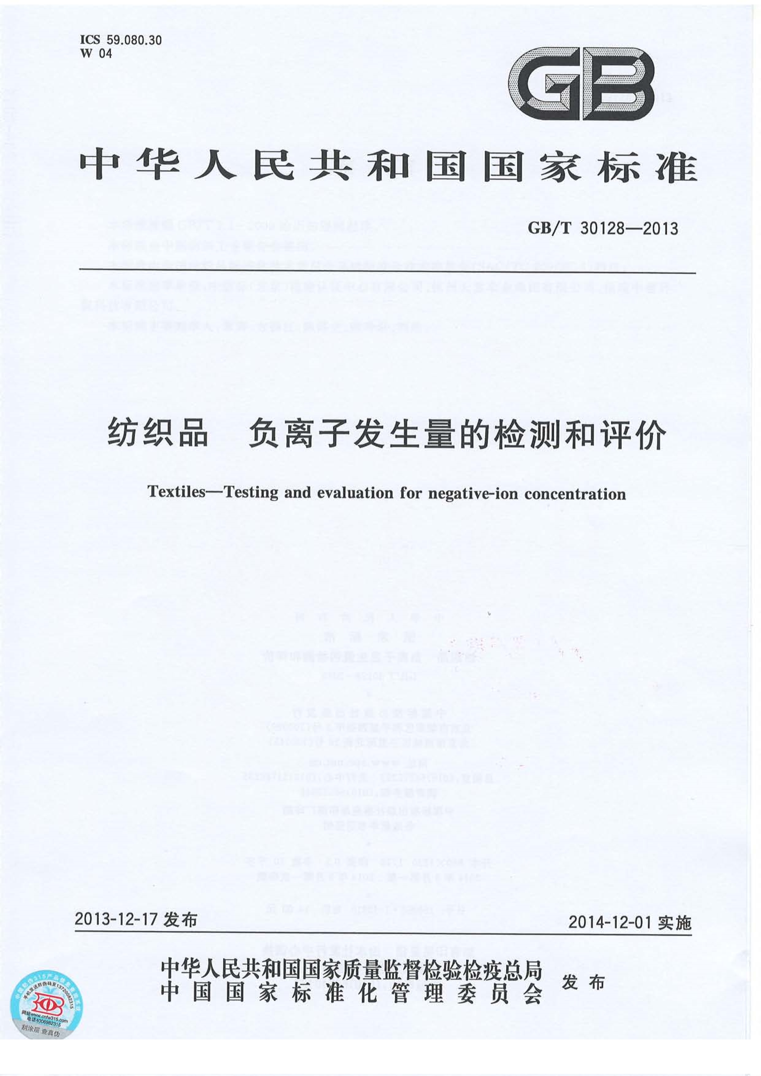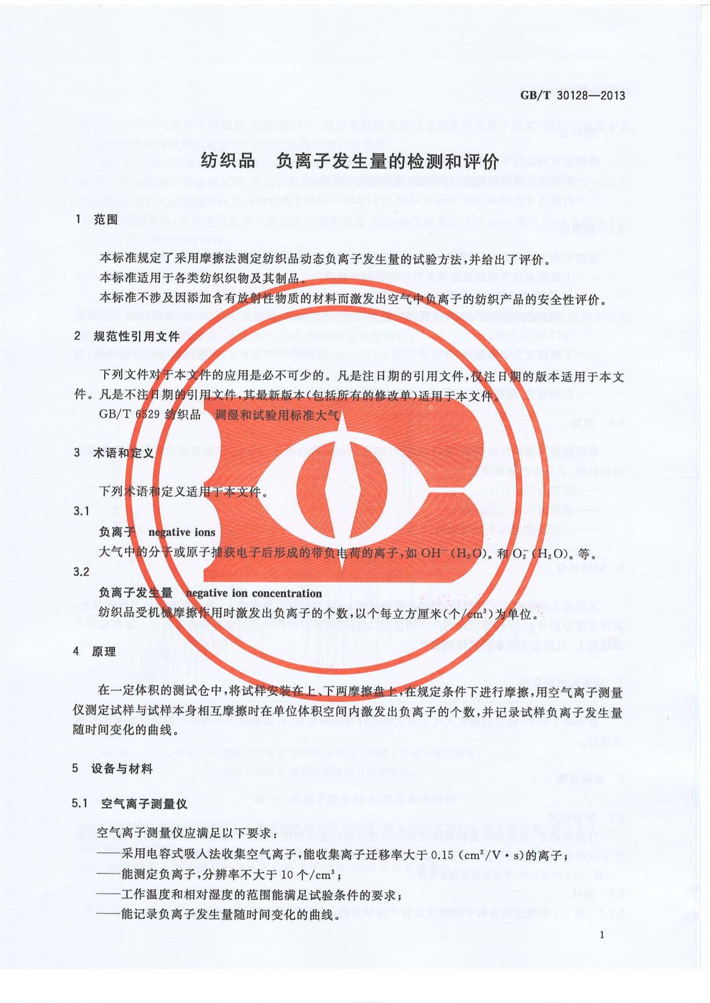 負(fù)離子紡織品測試標(biāo)準(zhǔn)國標(biāo)GBT 30128-2013 萬儀科技_copy