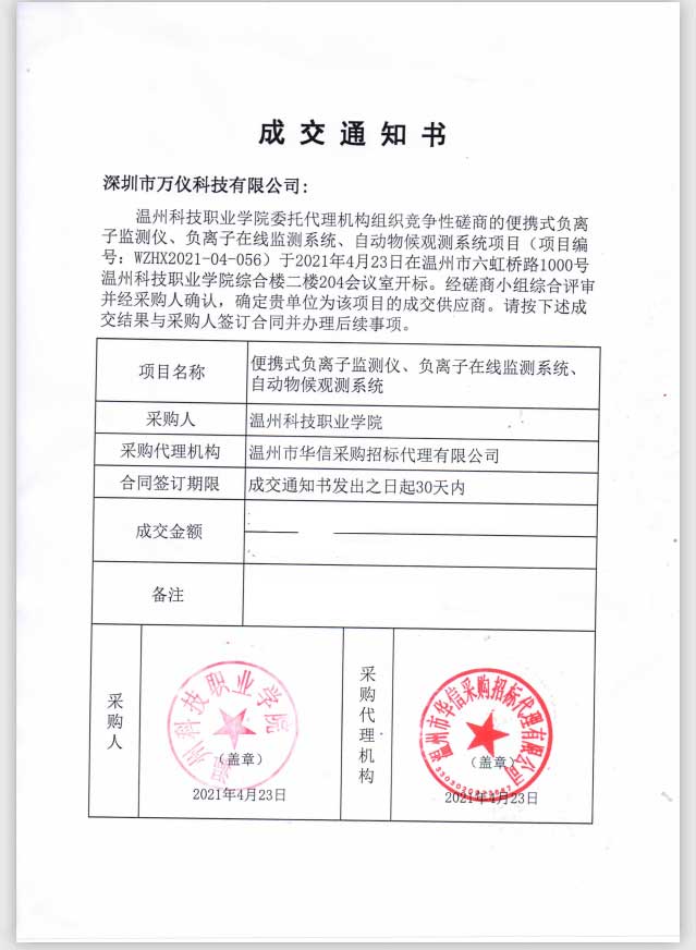 恭喜萬儀科技已中標(biāo),本次為溫州科技職業(yè)學(xué)院提供的設(shè)備型號為:ONETEST-503XP便攜式負(fù)氧離子監(jiān)測儀及ONETEST-500XP負(fù)離子自動觀測系統(tǒng),均為萬儀科技主打產(chǎn)品。