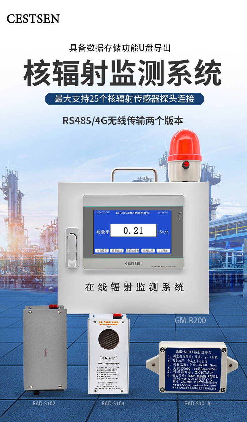 GM-R200輻射在線監(jiān)測(cè)系統(tǒng)是以蓋革彌勒(GM-TUBE)為監(jiān)測(cè)核心的輻射監(jiān)測(cè)儀,多種規(guī)格的傳感器可選,監(jiān)控終端可選擇25個(gè)傳感器,用于同時(shí)測(cè)量多個(gè)區(qū)域的輻射,并記錄各種數(shù)據(jù),方便的USB接口導(dǎo)出數(shù)據(jù)以便分析和考核。監(jiān)控終端是一個(gè)7寸觸控?cái)?shù)據(jù)采集器,內(nèi)置存儲(chǔ),可設(shè)置的報(bào)警閥值,標(biāo)配聲光報(bào)警裝置;同時(shí)輸出RS232, modbus-rtu協(xié)議。